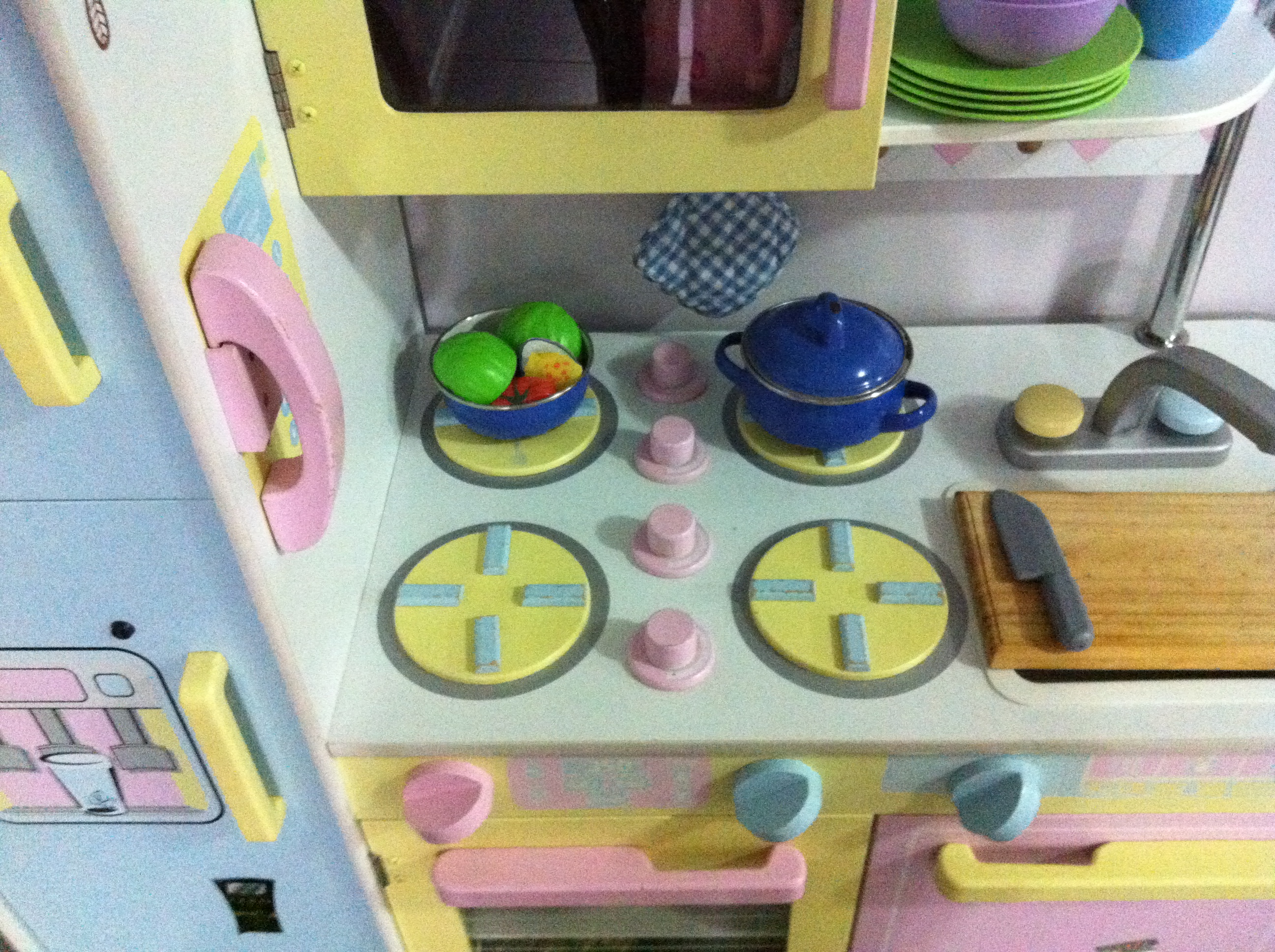 Miss L was lucky enough to be given her cousins’ lovely timber play kitchen a couple of years ago.  She spends hours in it – preparing picnic food, supper for her toys, whipping up cakes and batches of biscuits, making tea…not much dish washing goes on though.  Hmmm…I might have to encourage that a little.