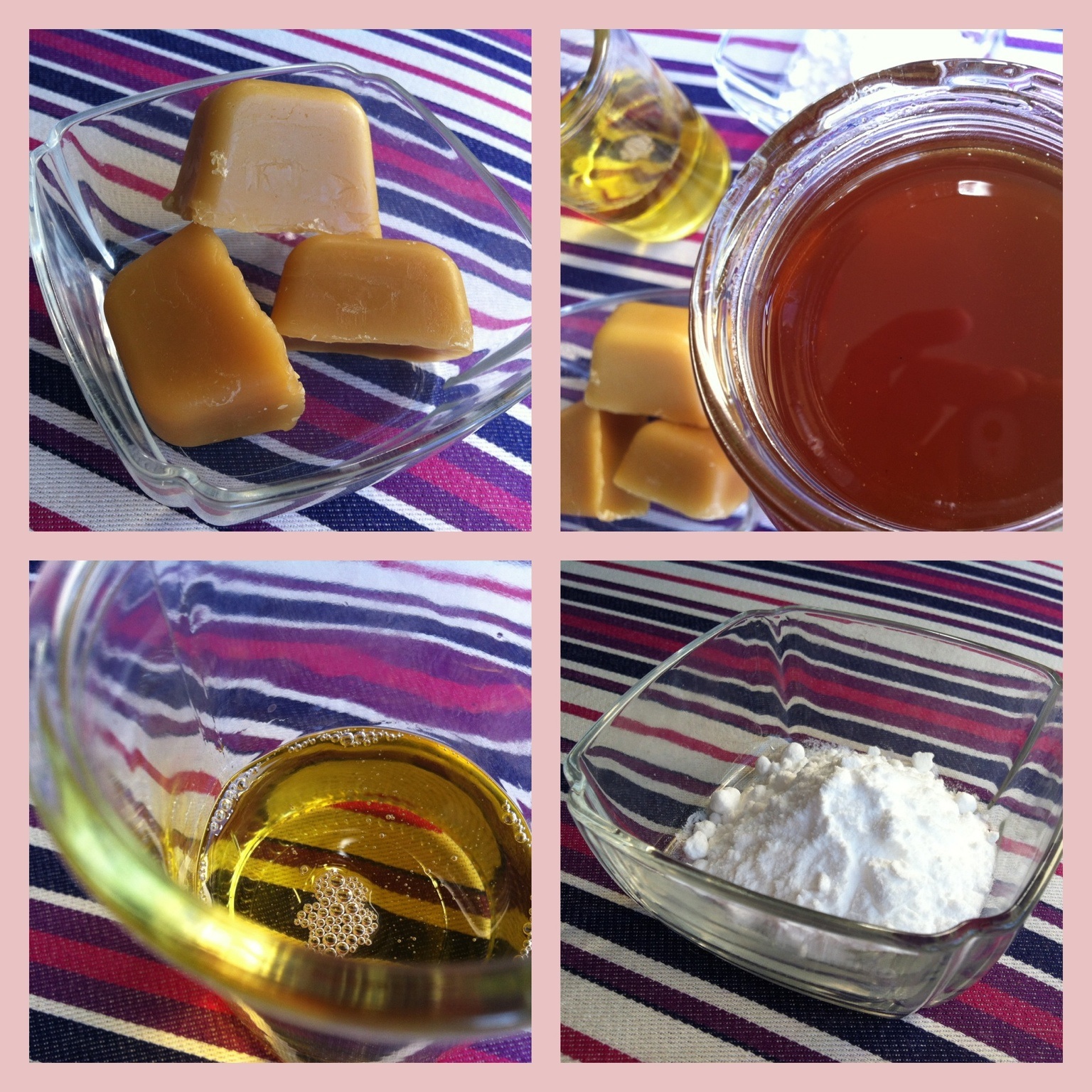 Ingredients (clockwise from top left): beeswax; honey; bicarb soda; macadamia oil