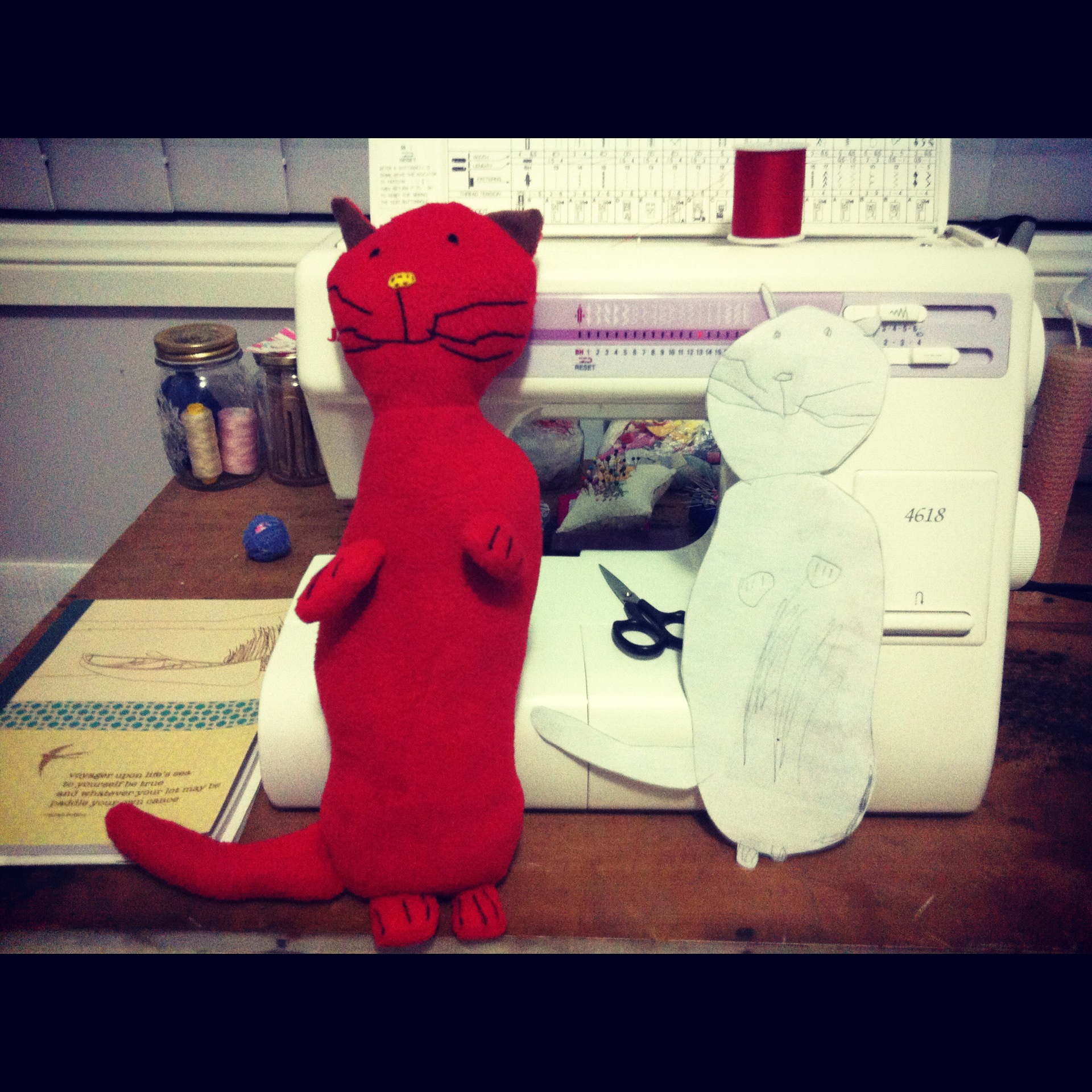 Ginger – for Softies for Mirabel – from reclaimed jumper and cords. Designed by Lucy who was three at the time.